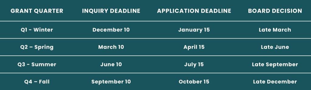 Our inquiry window for each grant quarter wraps up on December 10th, March 10th, June 10th, and September 10th. Please reach out any time before these dates so we can schedule a time to connect. We’d love to hear about your proposed project!